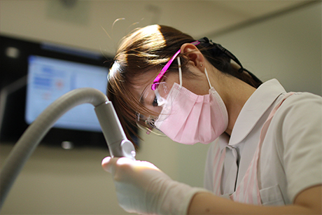 当院では最新式の4種類の歯科用レーザー治療器を導入しています。レーザー照射による治療は止血効果が高く、細菌などを除菌しながら進められるので、傷口の治りが早いのが特徴です。