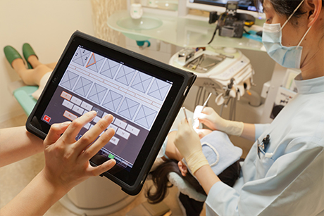 歯周病は進行にともない歯と歯茎の溝が深くなっていきます。そのためその深さを測定することで進行度合いの検査が可能です。通常は1本の歯のまわりで一番深い部分を測定し記録しますが、当院では歯を4つの部位に分けて細かく測定し、数値をiPadに入力します。