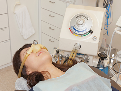 「笑気麻酔」とは鼻から医療用ガスを吸い込んで、不安やストレスを和らげる麻酔です。笑気麻酔を吸引すると穏やかでリラックスした鎮静状態になります。