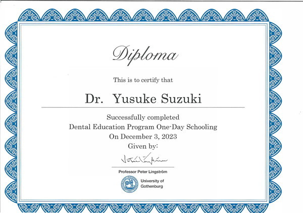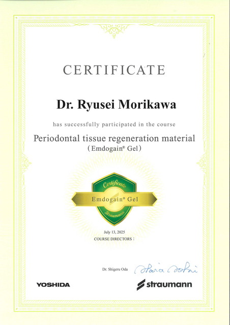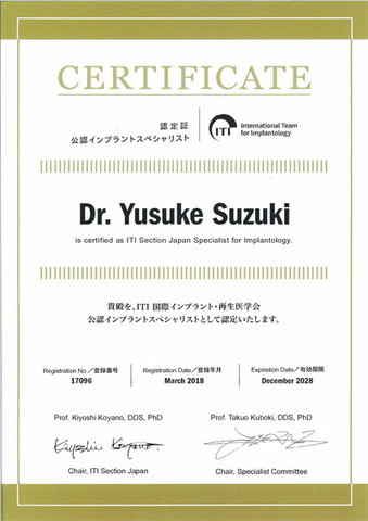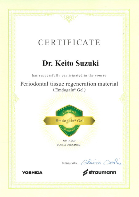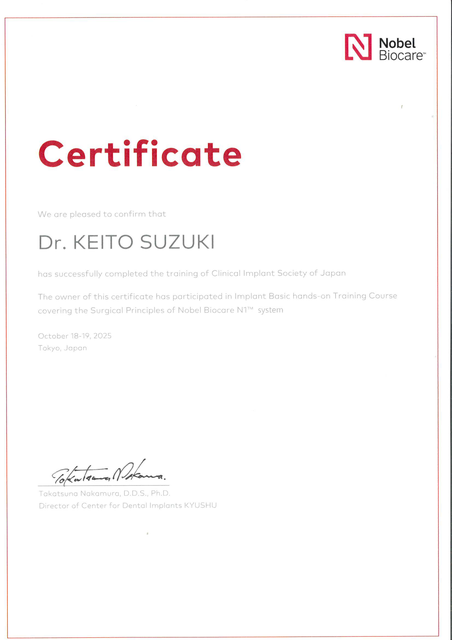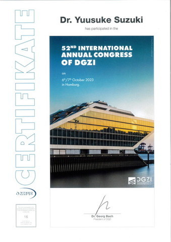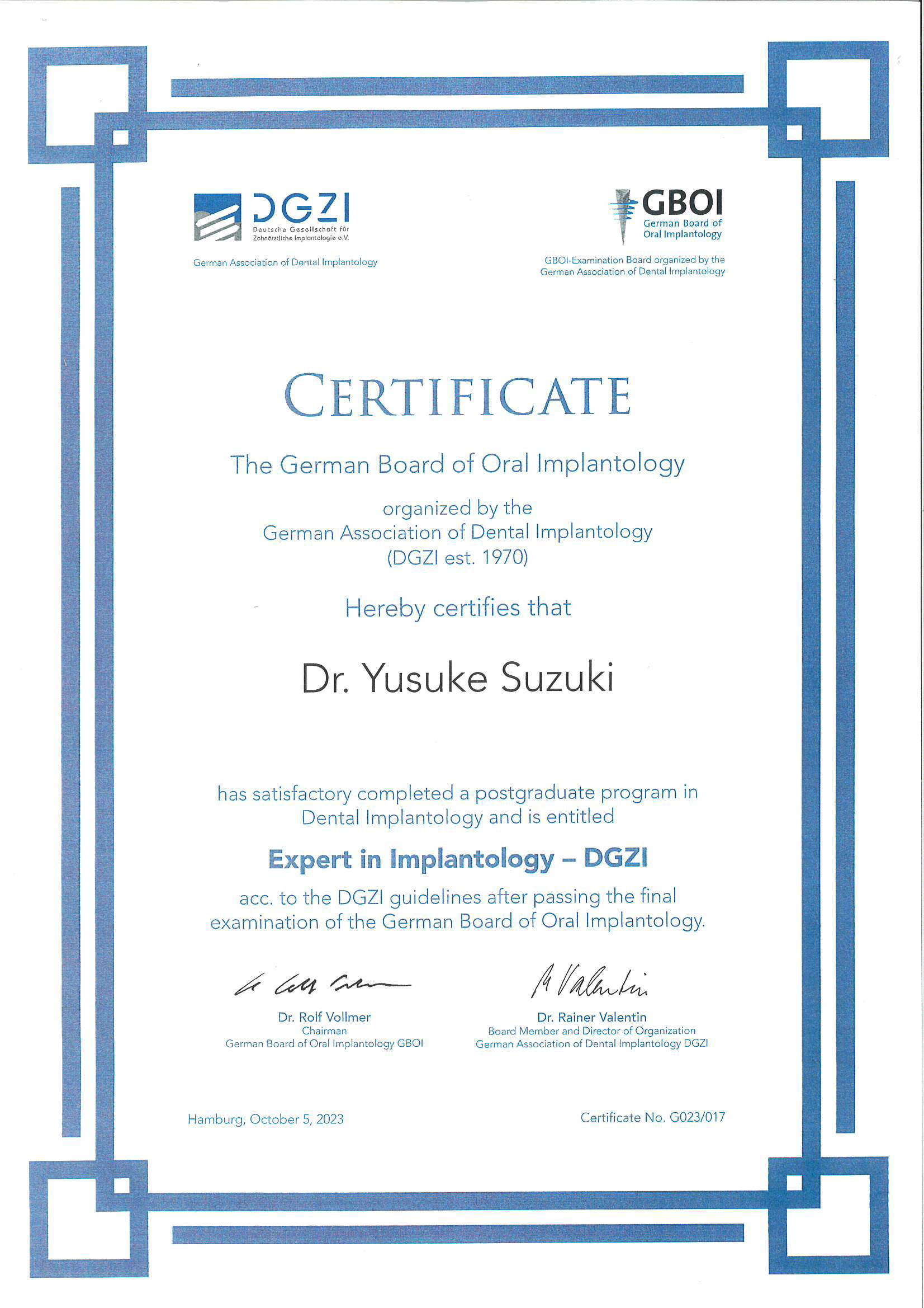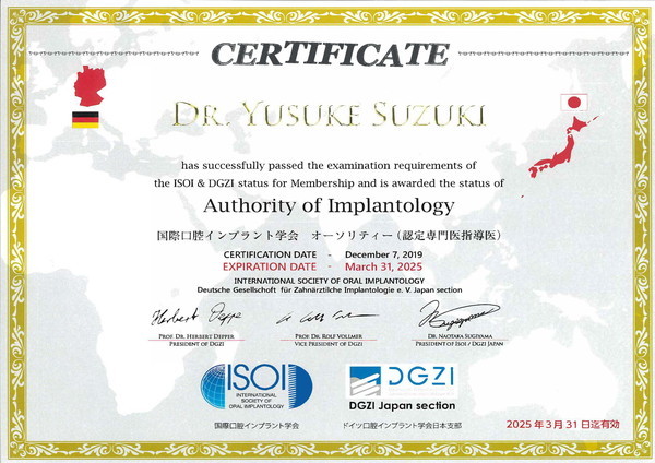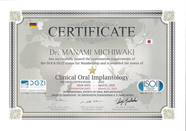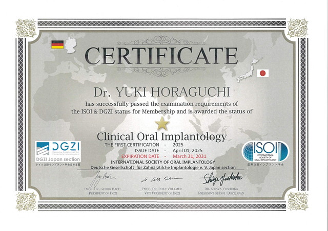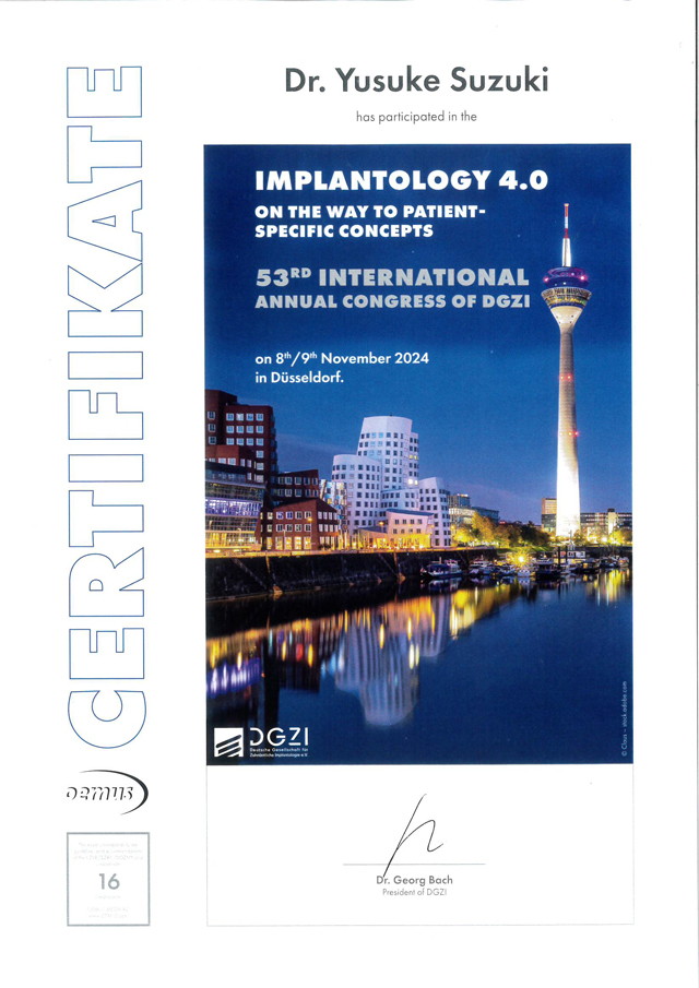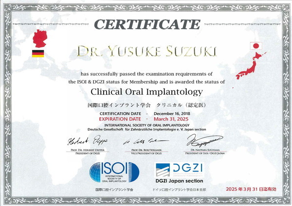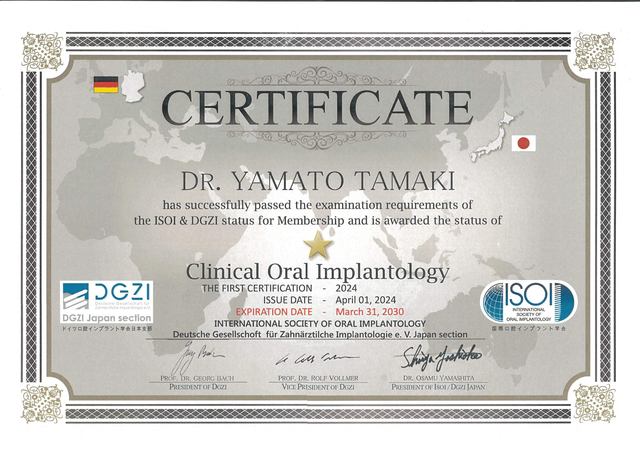ドイツ口腔インプラント学会(DGZI)のスペシャリスト資格(国際指導医)は、インプラント治療における高度な技術と知識を持つ証明であり、患者さまに安心と信頼を提供します。この資格を持つ歯科医師は、厳しいトレーニングと試験を経て最先端の治療法を習得し、安全で質の高い治療を提供します。