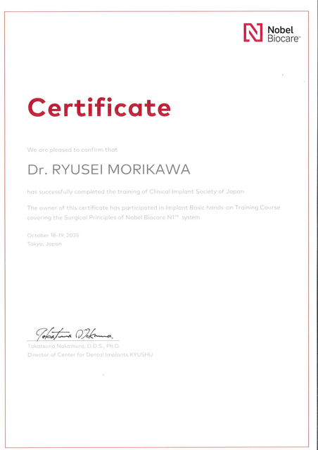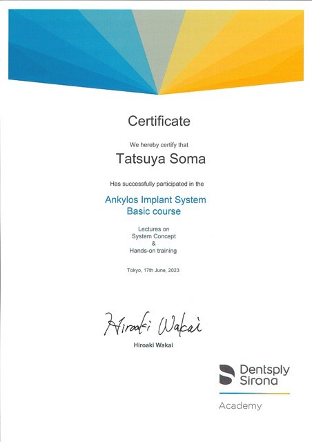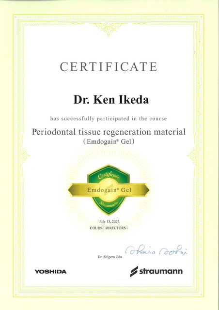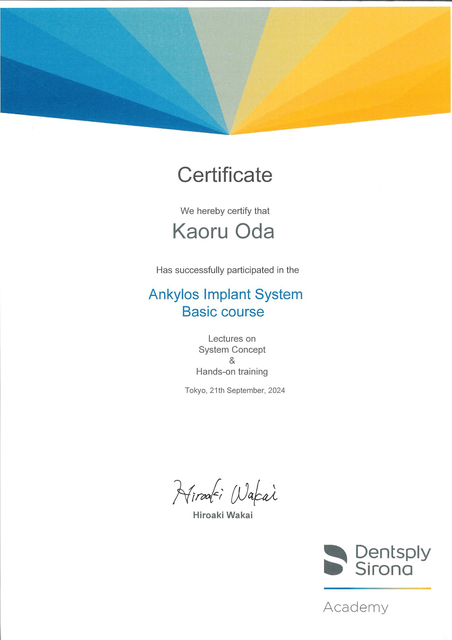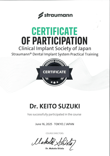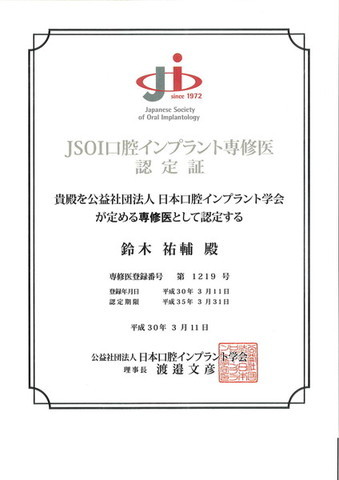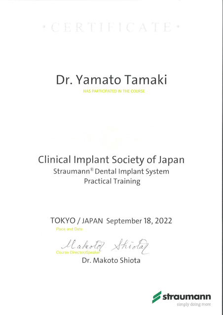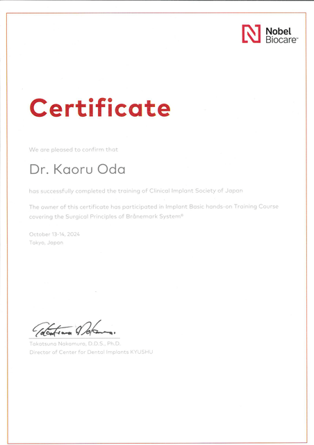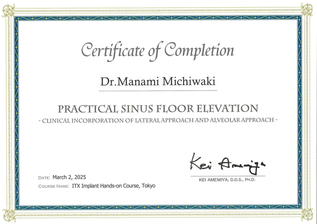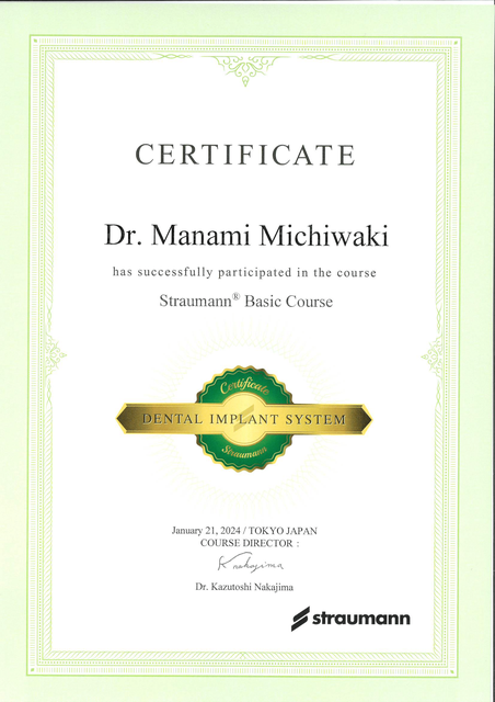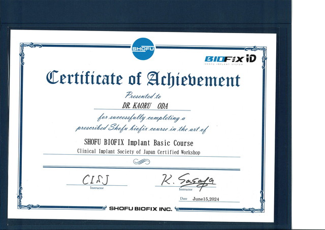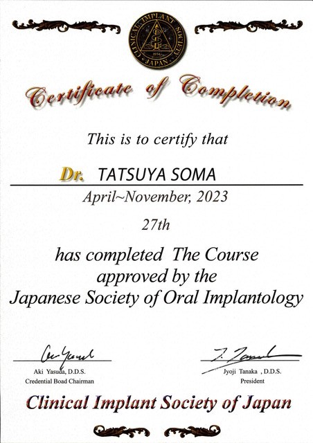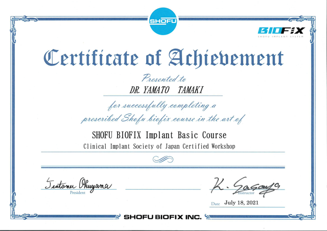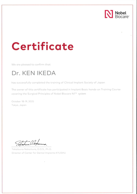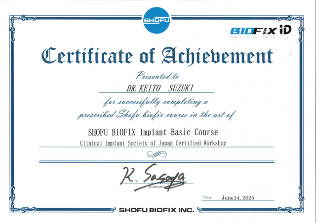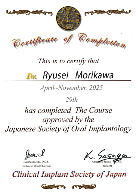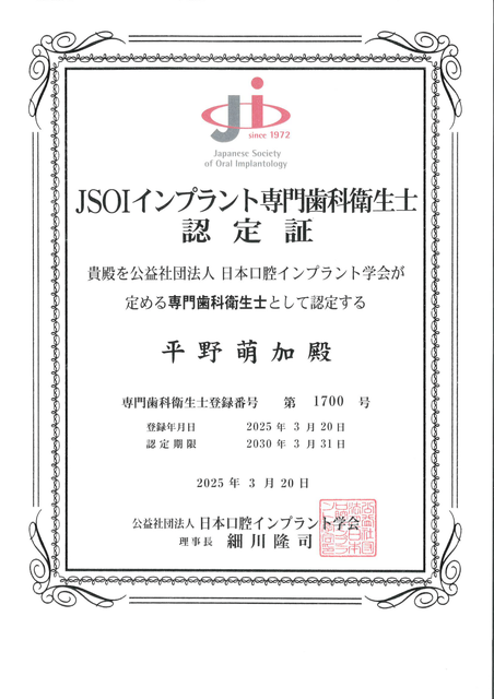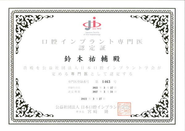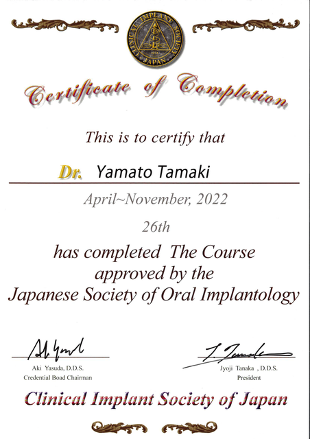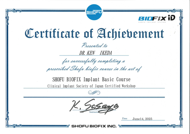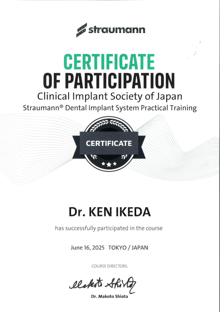 また、日本に帰国後、日本口腔インプラント学会の専門医資格を取得しました。これは、日本国内でインプラント治療に関する高度な技術と専門知識を持つ歯科医師に対し与えられる資格です。さらに、アメリカのAAID(American