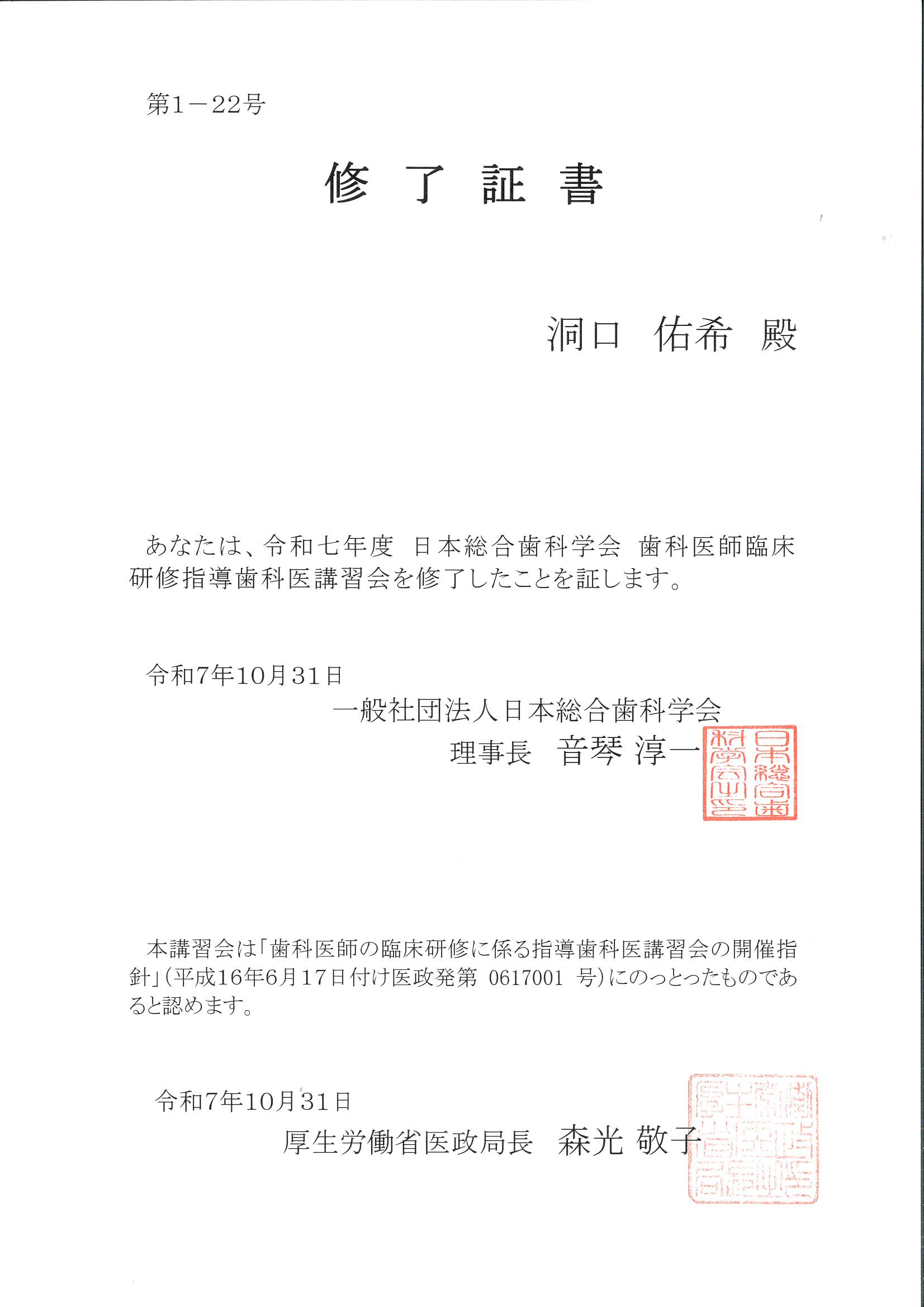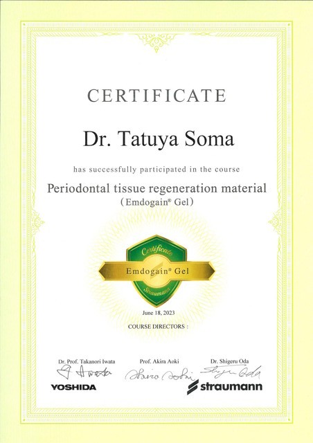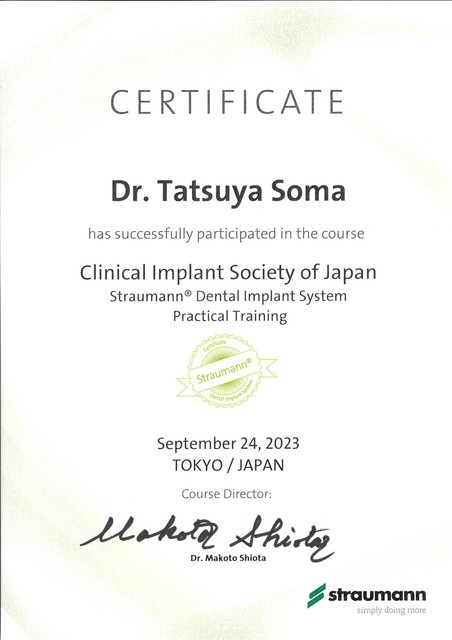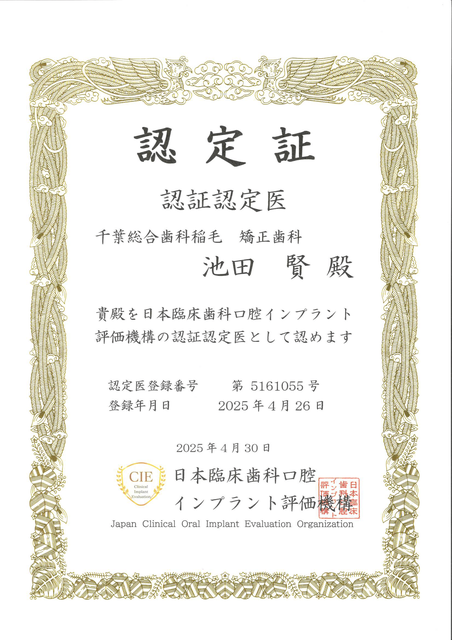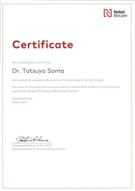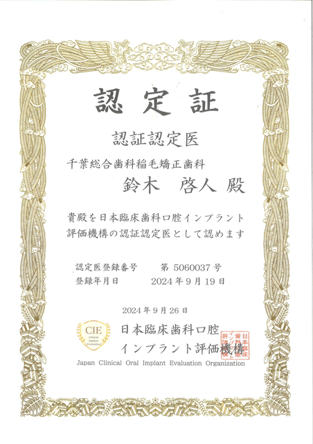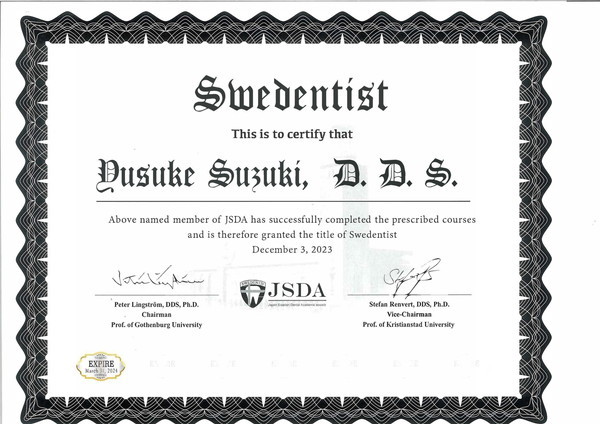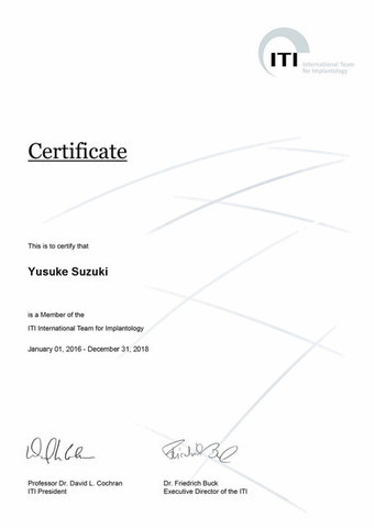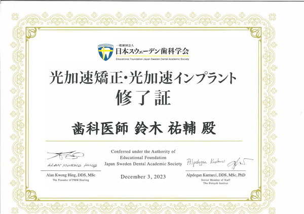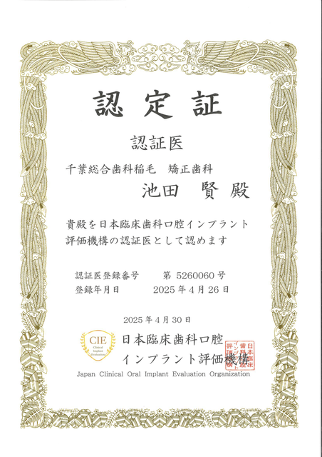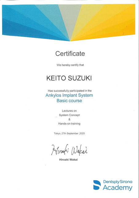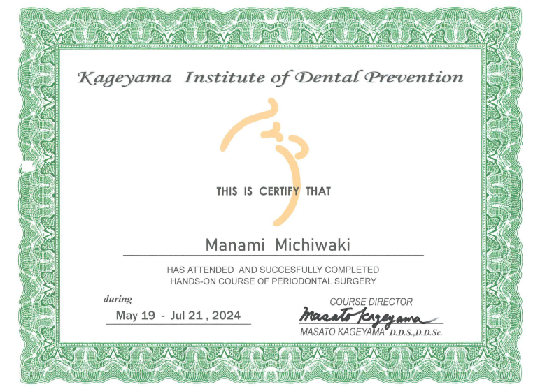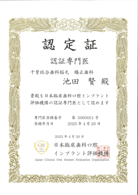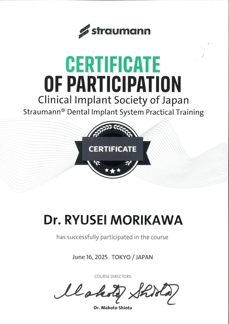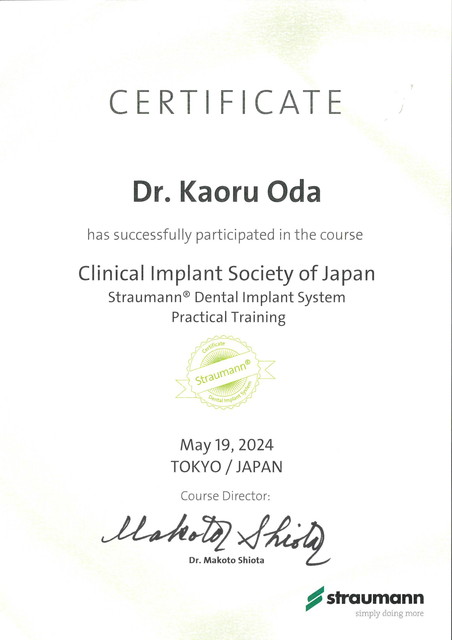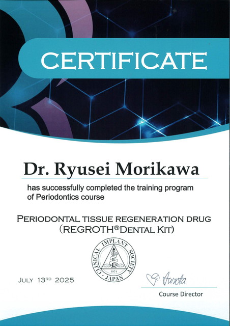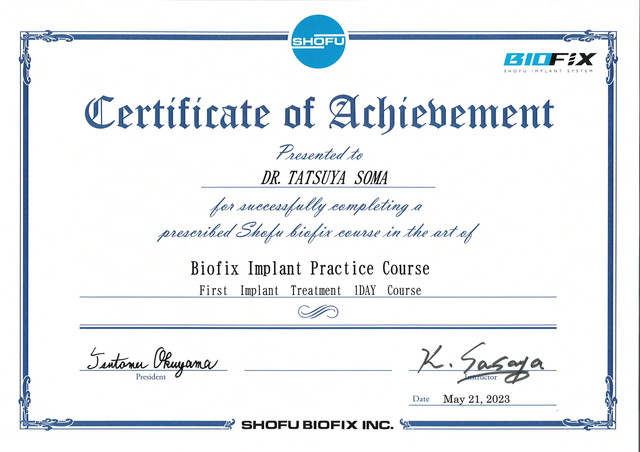 また、日本に帰国後、日本口腔インプラント学会の専門医資格を取得しました。これは、日本国内でインプラント治療に関する高度な技術と専門知識を持つ歯科医師に対し与えられる資格です。さらに、アメリカのAAID(American