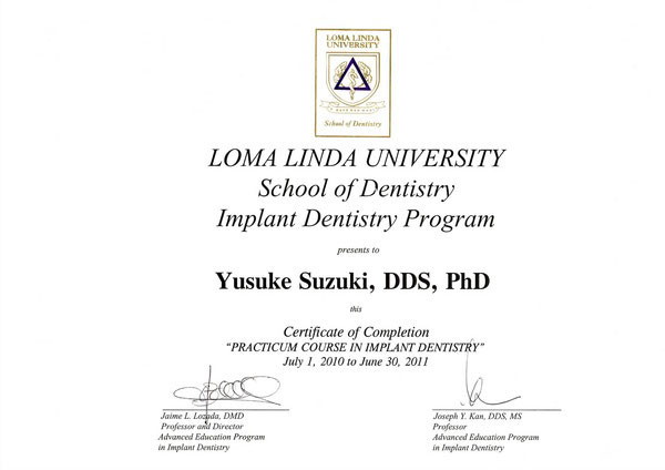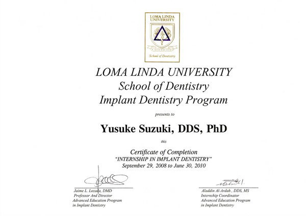 大学卒業後、さらに高度な知識と技術を習得するためにアメリカへ留学し、ロマリンダ大学インプラント科を卒業しました。ロマリンダ大学はインプラント歯科の分野で世界的に知られる名門校であり、そこでの経験は私にとって非常に貴重なものでした。在学中は最新の技術と理論を学ぶと共に、実際の臨床現場で多くの患者様と向き合いながら実践的なスキルを磨きました。