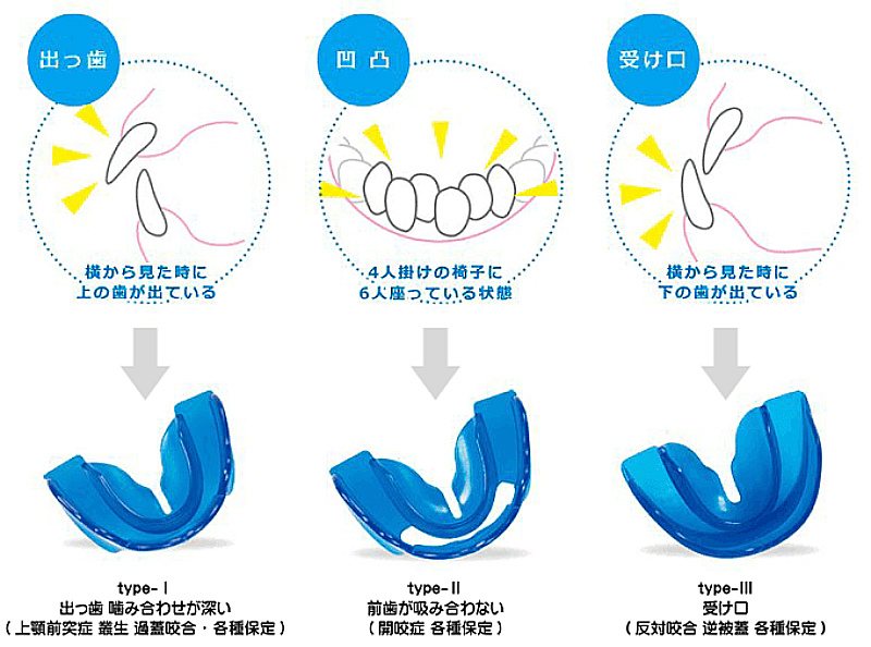 既製品で型があるため、歯型をとる必要がありません。小児にとって歯型をとる粘土のようなものは気持ち悪くなってしまう事もあるのでその点もメリットの一つです。また、熱可塑性(熱を加えることで自由に調整できる)のシリコン素材を使用しているため、装着感が良く、お子様も嫌がらずに使うことができます。お湯を使った簡単な調整をすることにより顎を広げたり、個々の口腔内に合わせて治療することが出来ます。
